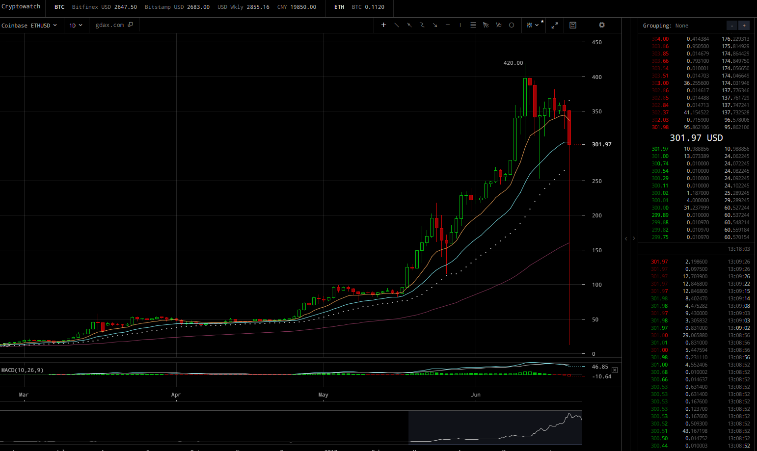 Not sure what just happened here, but someone just dumped a HUGE amount of Ethereum on GDAX. I was watching live and I saw the price tank unnaturally quick, all the way to $13 for a second, but it looks like we have already recovered from this massive sell order. Nearly gave me and I'm sure many others a heart attack!