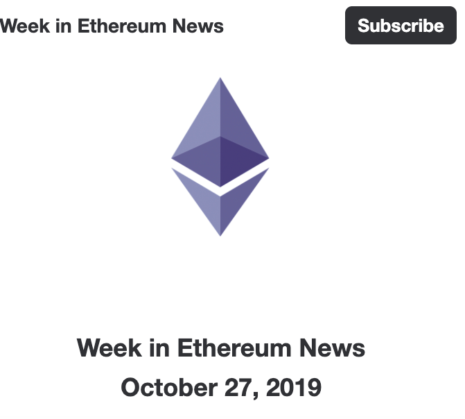 Latest Week in Ethereumevanvanness (54)in #ethereum • 6 years ago Week in Ethereum News for October 27, 2019 #web3 #eth #weekinethereum #crypto