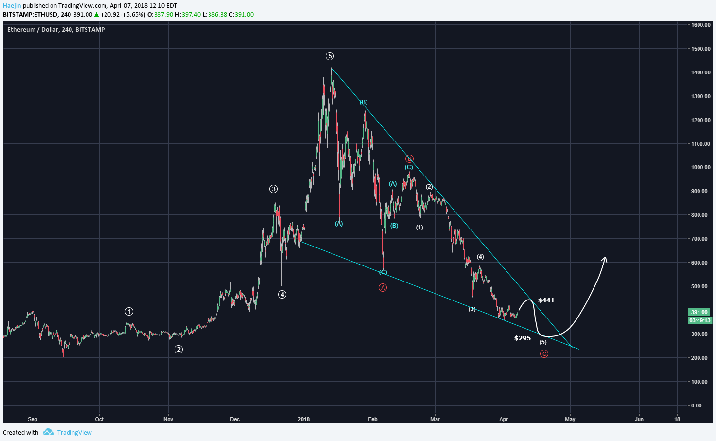Ethereum (ETH) COULD be compelte in its 5th wave, yes, there is a case for that and if so, price needs to bust out of the upper blue trend line ASAP. However, price is a bit distant from the apex and for that, ETH could rise to $441 to tag the upper blue resistance line and decline towards $295 for the completiong.