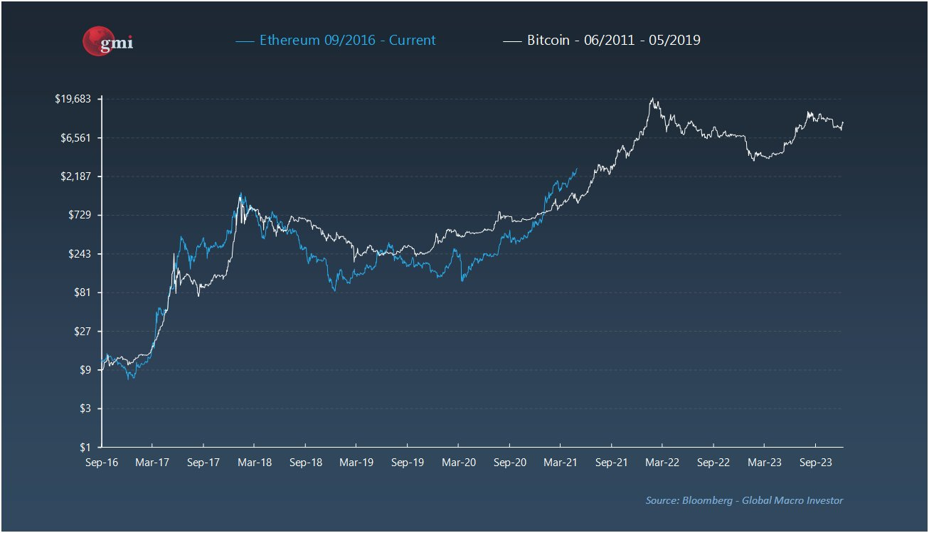 Ethereum Tracking Bitcoin's Price Movements (one cycle behind)