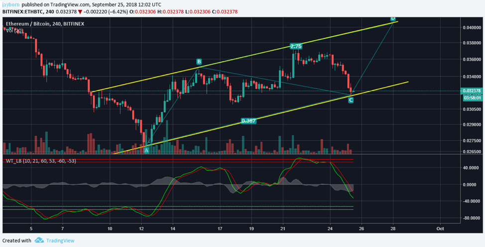 The above 4H chart for ETH/BTC shows more clearly how Ethereum (ETH) has finally broken out of its downtrend and has now begun a new cycle. Since Sep 10, 2018, the price of Ethereum (ETH) has been trading in an ascending channel against Bitcoin (BTC) after breaking the downtrend. The price could progress further along the ascending channel in an ABCD formation as visible on the above chart. If Ethereum (ETH) were to continue trading at this pace, it could certainly reach a new all time high against Bitcoin (BTC) as well.