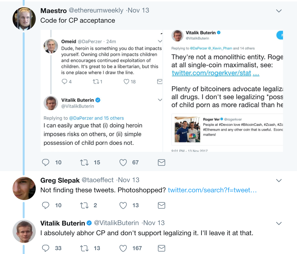 For those of you who have been recently outraged by screenshots of Ethereum's creator Vitalik Buterin's twitter, please read the conversation. Child porn was brought up by a twitter user who was asking about a bitcoin cash developer who had made comments on the issue before, and Vitalik was responding to that. Does it look bad out of context? Yes, terribly. It is it a taboo conversation to have on twitter? Yes, absolutely. But it was a conversation that was based on two subjects that were introduced out of context, they were not brought up by Vitalik.