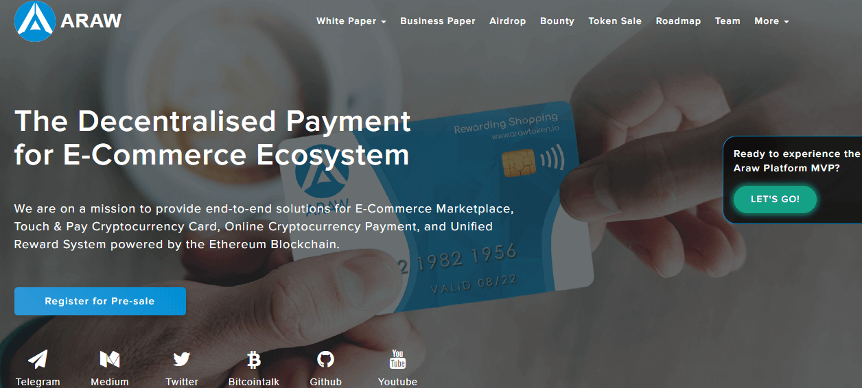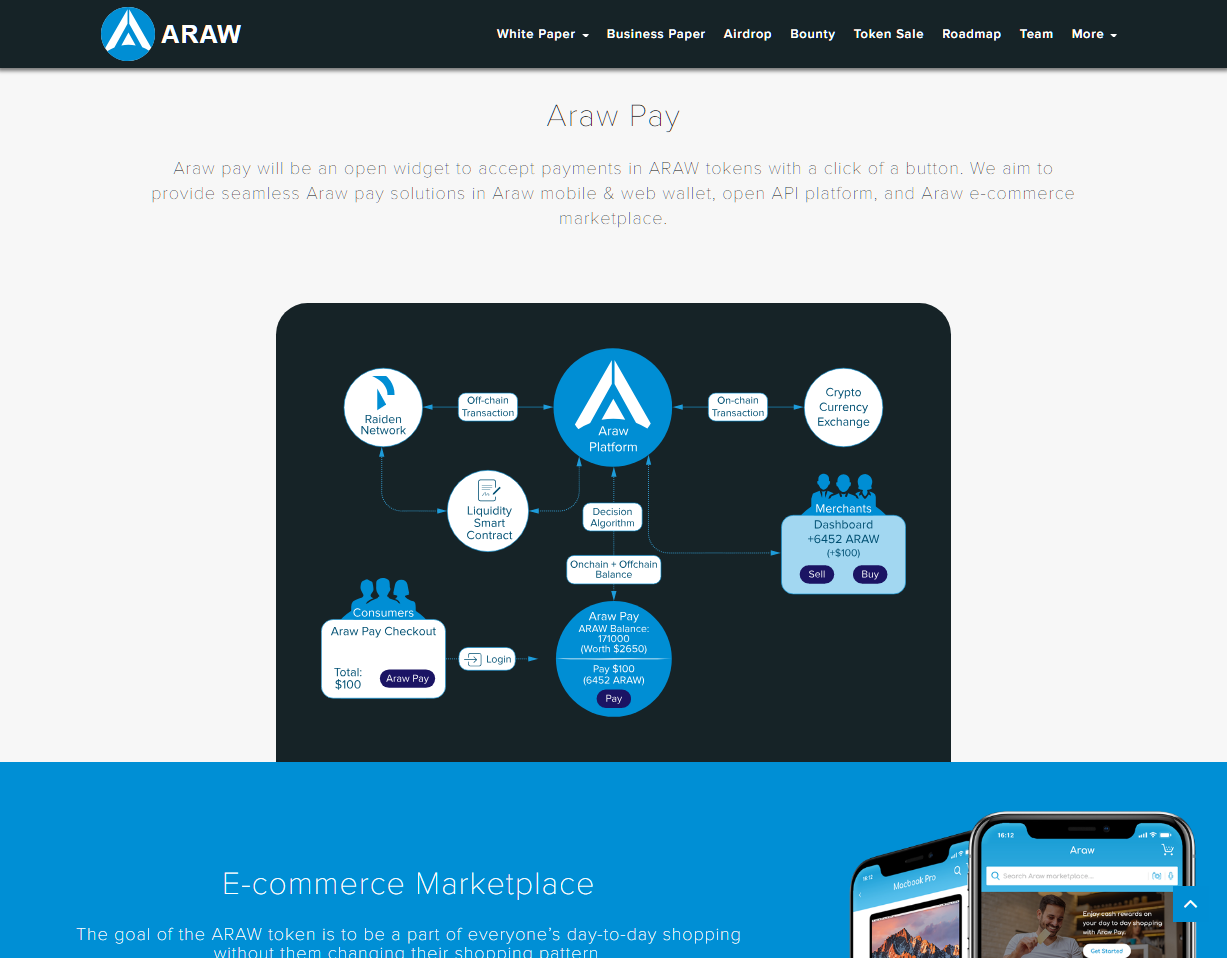 ARAW è la prima compagnia al mondo la cui missione è combinare i vantaggi dell'industria dei pagamenti e dell'e-Commerce, fornire soluzioni complete per il mercato dell'e-Commerce, carte di criptovaluta contactless, pagamenti di criptovaluta online e un unico sistema di premi che lavorare sulla blockchain di Ethereum. Lo scopo del token ARAW è di essere parte degli acquisti quotidiani online e in negozio.
