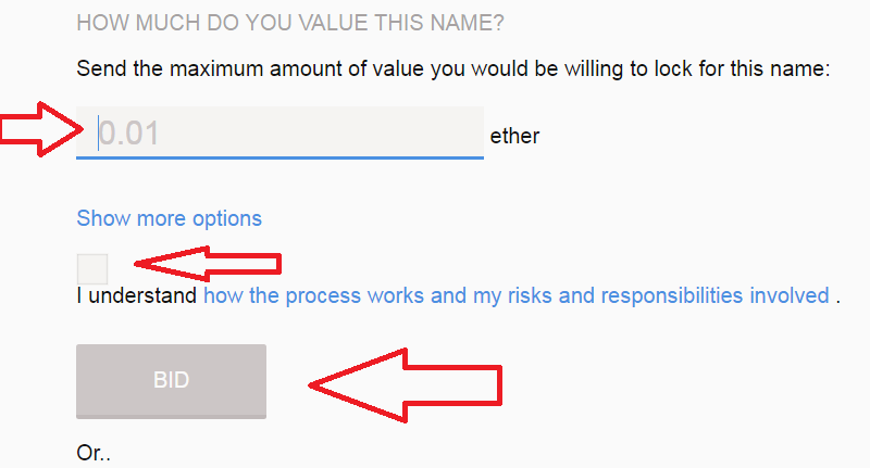 - If the .eth address you desire is available enter your bid in the bid screen towards the bottom. Select the "I understand" statement and click bid.