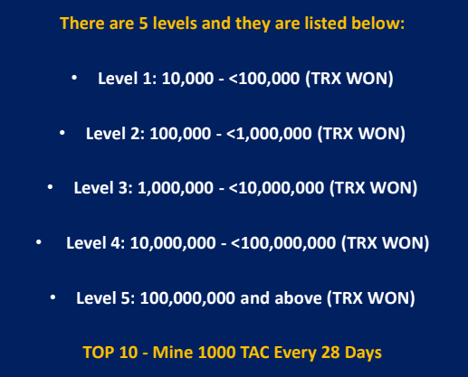 As a player and a registered member in the platform, there are 5 levels which will be allocated each to every players according to the total number of TRX one has won on all available games which is clearly shown on the image below. 10% of TRX generated from TRONscratch would be issued to TAC token holders who freeze their TAC token so as to ensure player continuity with the platform.