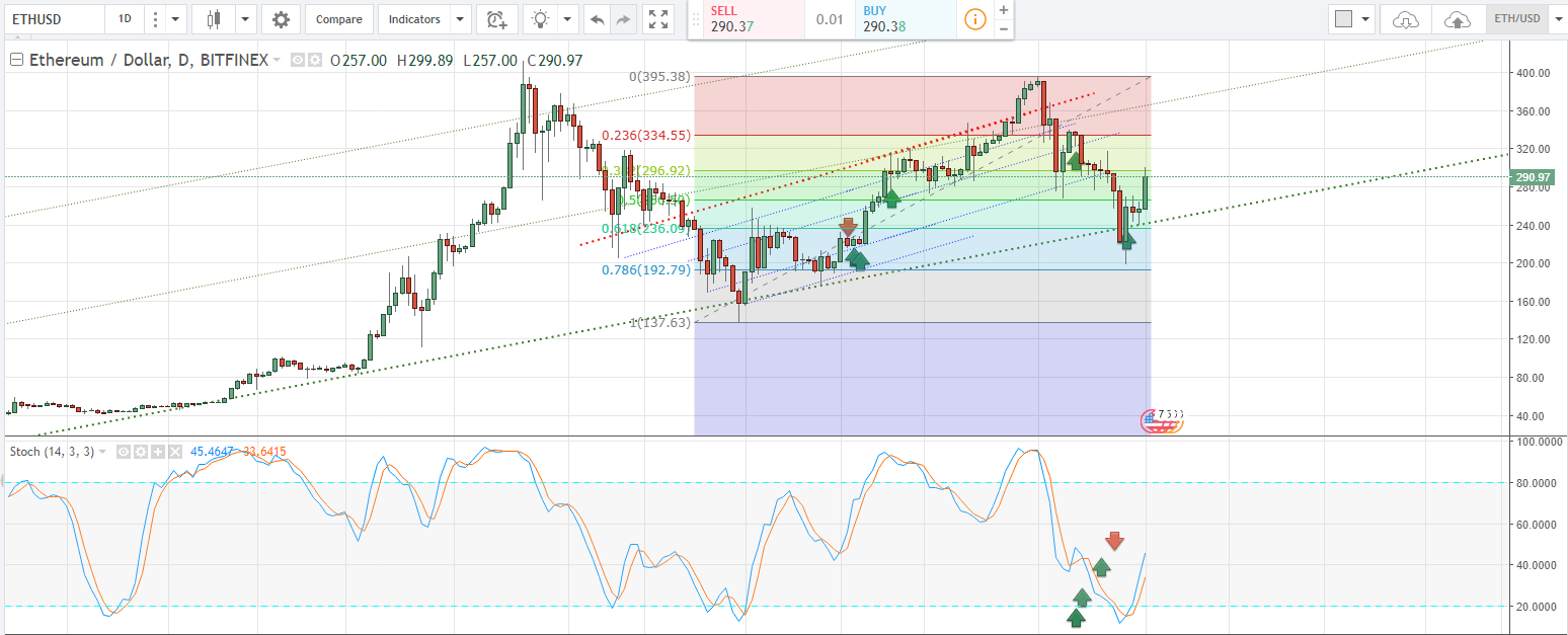 Last week we went through the importance of Fib. retracements, and importantly the .786% describing as the last line of defence before a new trend could take place. At $200 ETH bounced with good momentum. We are now re-testing the previous support turned resistance at $300 level. In Elliott Wave pattern, it seems the price moves from the beginning of Sept. to present day has been a corrective move. While a corrective move suggest that a price move higher or all time high should manifest, the corrective move could still stagnate sideways until a breakout can be had. So the best way to watch is to be aware of the signal and where its at.