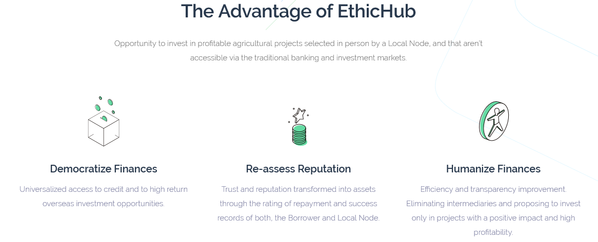 Exchange which will work with EthicHub platform will convert the tokens from the borrower’s wallet to their local currency. When the local currency will be used to pay the loan, the exchange will convert it again into tokens and send into the definite investor’s wallets.