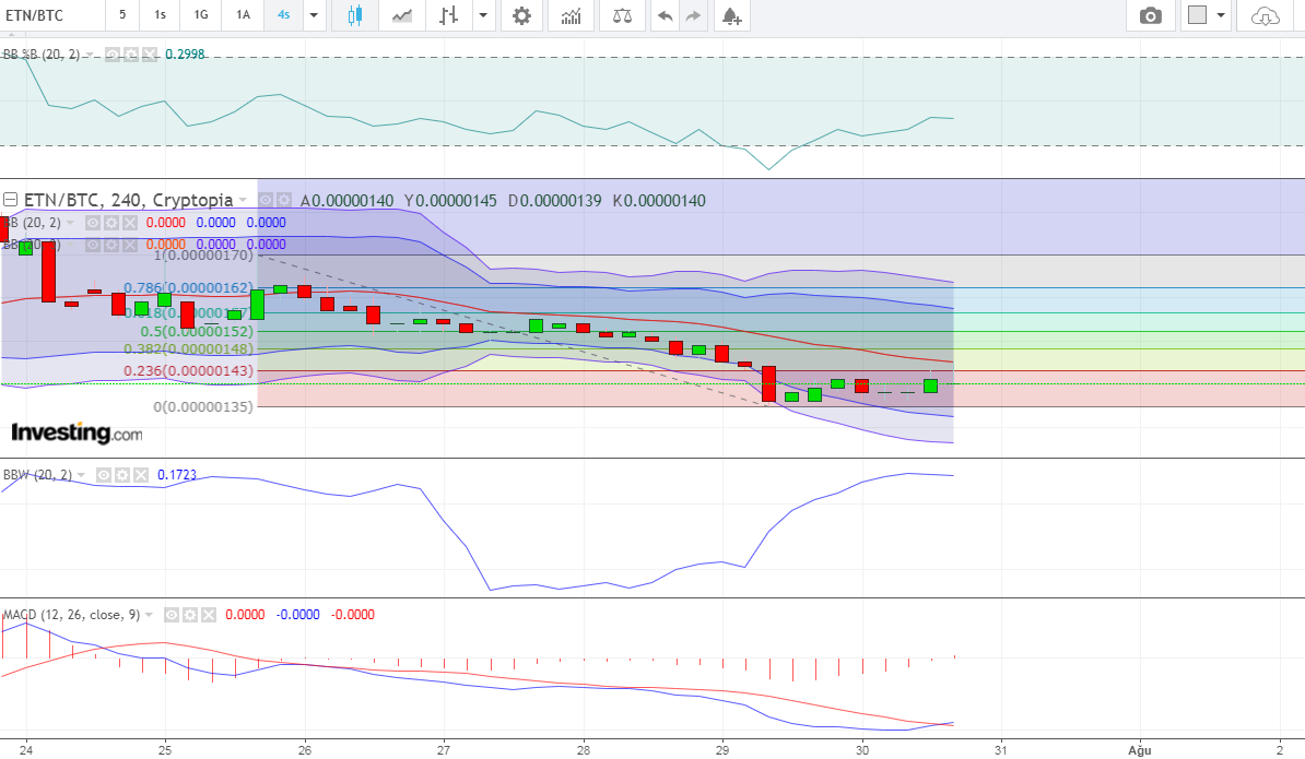 ETN commentsneotheone (25)in #etn • 8 years ago for 4h trend for ETN, it is supposed to increase according to MACD and bollinger 2ss. first resistance is 0,00000143. after finishing it next one will be 0,00000148. #cryptocurrency #btc #crytopia #electroneum
