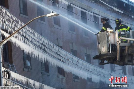 当地时间2018年1月2日,美国纽约,消防员对抗布朗克斯区的大火。火灾发生在寒冷的凌晨,消防部门喷水带来了“冰封世界”。