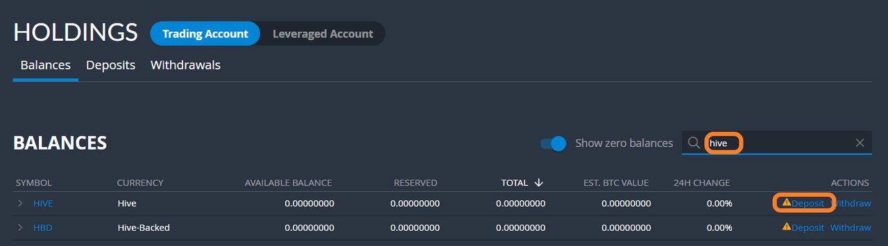ログインし上部のメニューから「Holdings」を選択します。検索窓に「hive」と打ち込むと「HIVE」と「HBD」のが項目にでてきますので「Deposit」をクリック