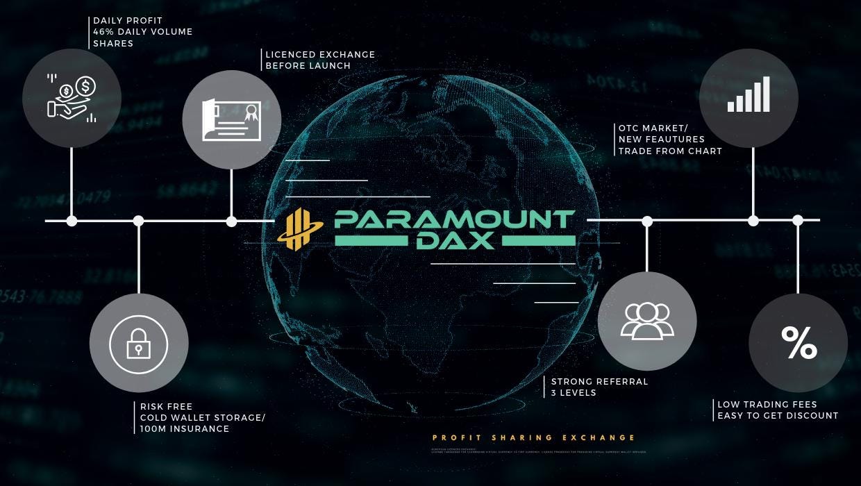ParamountDax mengembangkan pertukaran sepenuhnya terdesentralisasi dari awal, dengan desentralisasi penuh sebagai persyaratan utama, serta likuiditas instan di pasar, dukungan pelanggan, dan lingkungan perdagangan yang aman dan bebas risiko. Demi pengembangan proyek, ParamountDax menetapkan tiga ambang batas, soft cap di 1,75 juta USD, tutup tengah di 4,25 juta USD dan hard cap di 9,31 juta USD.