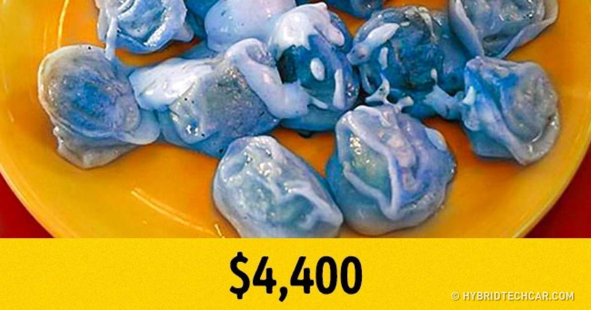 - Golden Gates restaurant in New York offers its customers these dumpling, where apart from veal, pork, and beef there is one more ingredient. It is the gland of a deepwater horned lantern fish, which gives the dumplings their peculiar blue tint.