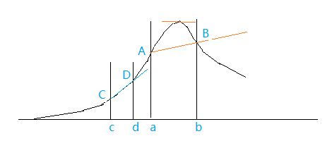 假设 y 只依赖于一个变量,是非线性关系。最大点在什么位置,我们不清楚。 假如用 a,b 两点做试验,得到了直线AB, 这条直线的优化方向指向峰的一侧,那里是“山谷”,越往外推,距离峰越远。