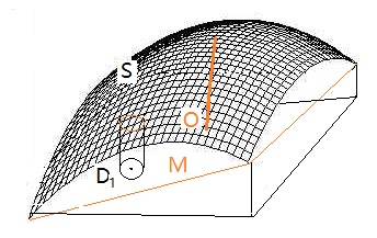 图 2 模拟二变量的情况,曲面 S 代表一个二元过程的本来曲面,它的最大值(优化点)是那条红色竖线,位置在点 O。 四个点拟合得到平面 M。那么,我们推断最大值点在右上方。外延出去越远,离真正的优化点 O 越远。