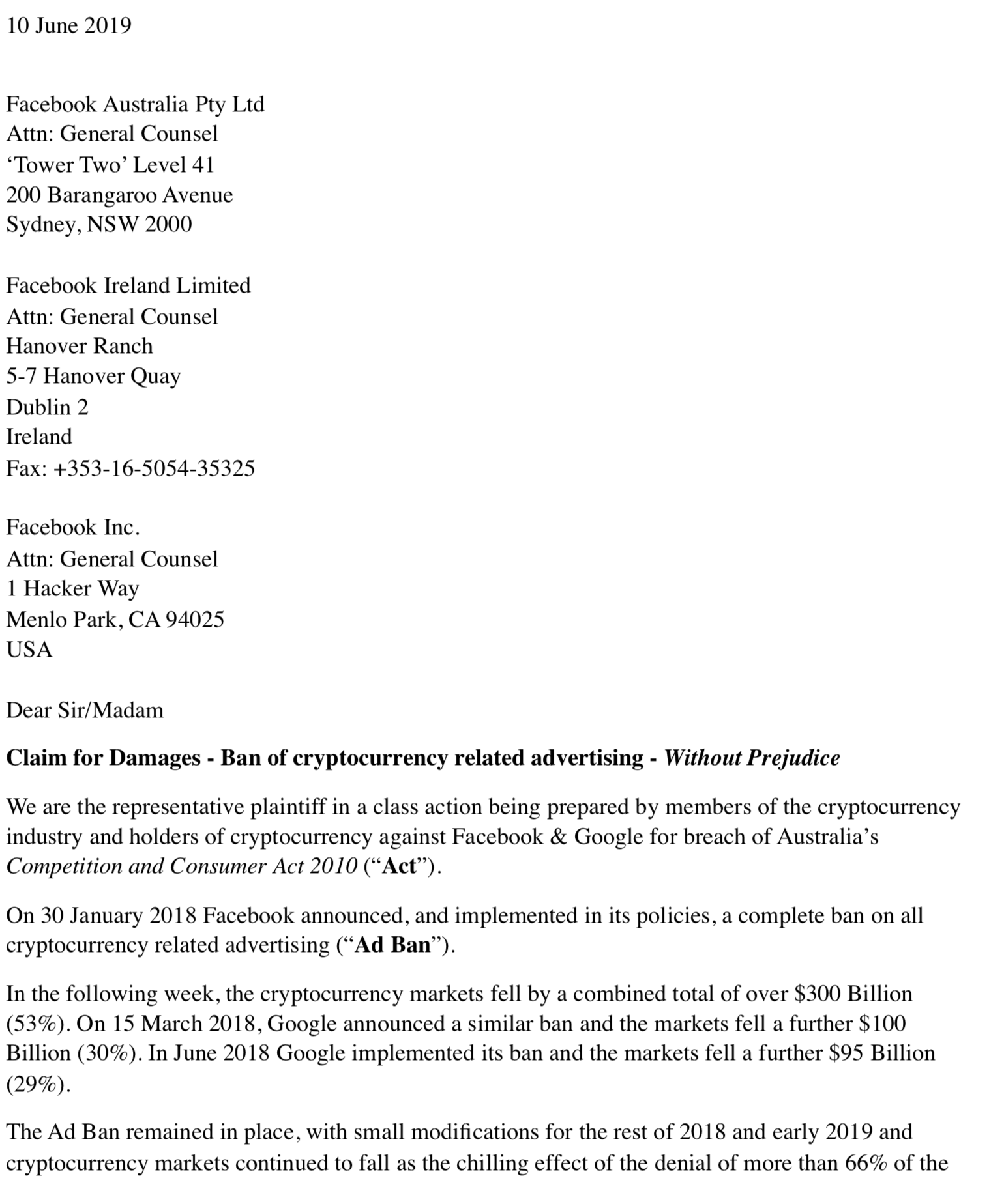 So this week we sent out the first nasty legal letters to Facebook & Google regarding the Class Action Lawsuit against them over the Crypto Ad Ban.