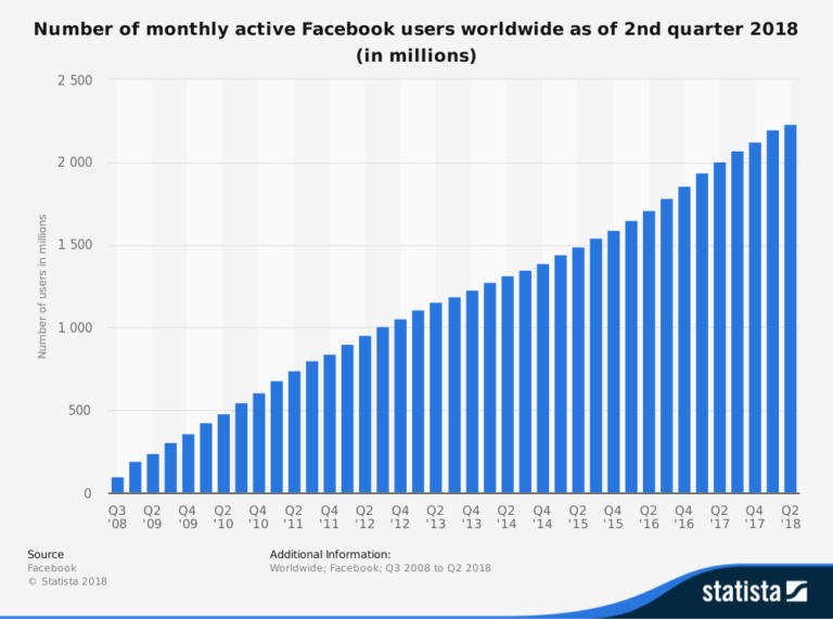 Number of monthly active Facebook users worldwide through the second quarter of 2018 (in millions)