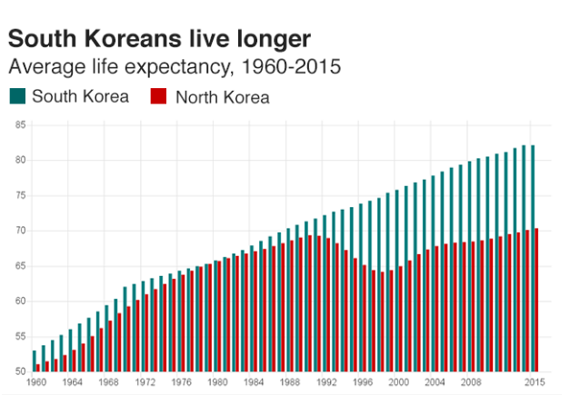 In the late 90's, due to famine slides, the expected life expectancy in North Korea decreased rapidly, but this element was also removed, so the average average of South Korea compared to South Korea is 12 years less.