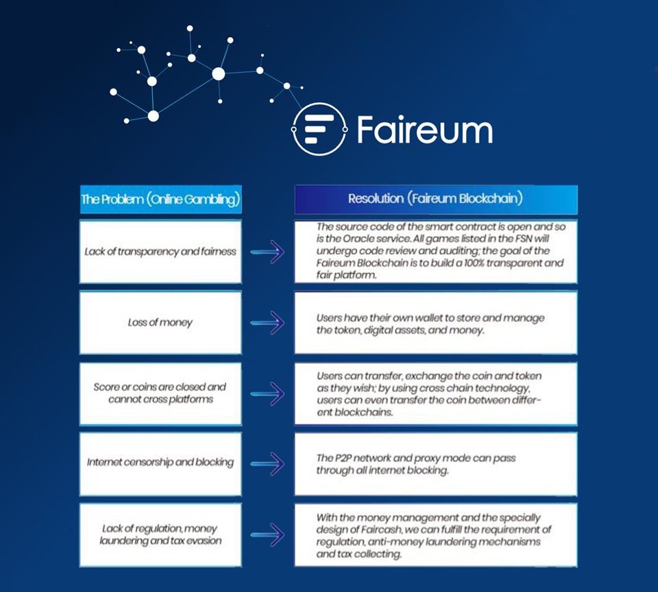 There is also a good solution for the disposal of assets, the volatility of chips during gambling and the exchange of various assets. Faireum combines security and transparency, the distinctive features of the ring chain, and includes many original features such as various protocols, local capabilities, multiple algorithms, inter-company asset swap, and parallel business expansion capability.