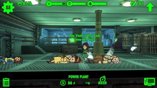 The concept of the game itself is simple enough: build a Vault that produces enough food, water, and energy for its dwellers to survive and also protect them from random dangers. The means of producing those necessities and the dangers interrupting that pursuit have a few subtle variations, but exploring the wasteland and embarking on quests are the only things that actually break up the monotony. The dialogue during those quests and the journal entries a dweller makes while out in the wasteland are both surprisingly and darkly hilarious. Combining this clever writing with the excitement of collecting new items, the time spent outside of the Vault invigorates time spent inside it. However, that feeling can only last so long before the staleness of the majority of the experience overwhelms it. The same can be said about customizing dwellers or upgrading their equipment. More options, many of which are obviously worse than others, cannot make up for the fact that there's nothing more to do with them.