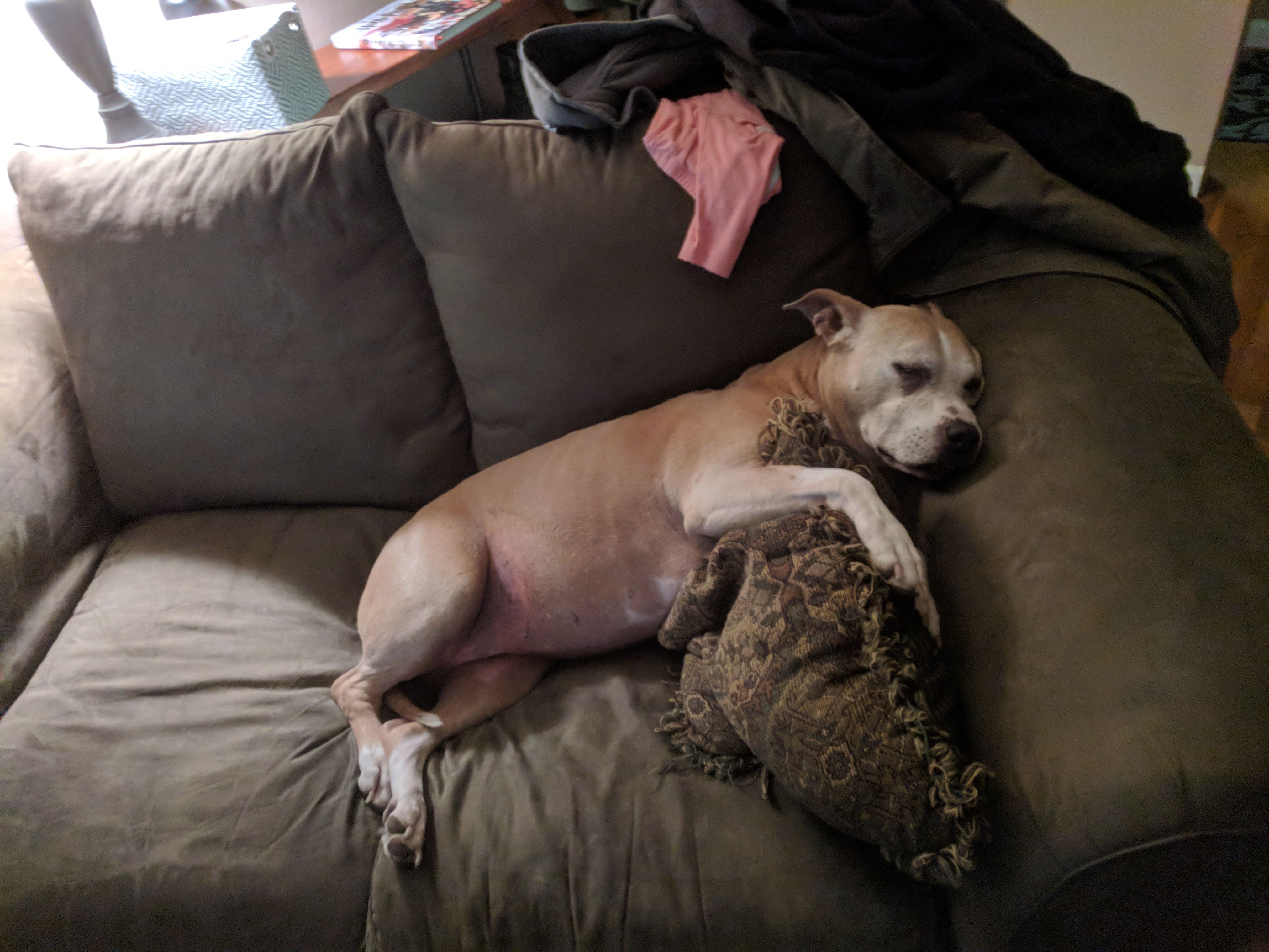 My family had had a pit mix growing up, Pudge. He was a great dog, mild mannered, calm, and moderately active. I'm an animal lover, so after he died I had this yearning for some animal interaction. I actually ended up volunteering to walk dogs at the animal shelter briefly. But I knew I wanted another dog, and I knew I wanted a pitty.