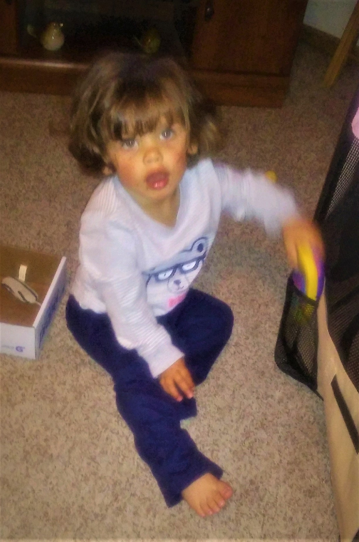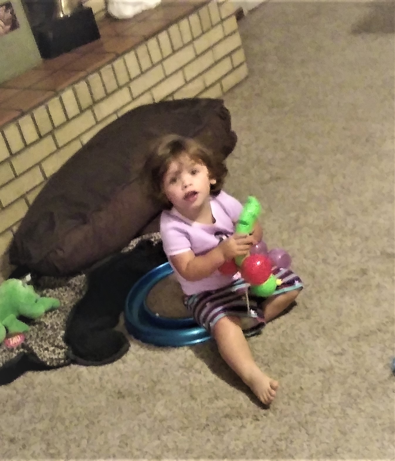 Play time at home with her toys... and pet toys.