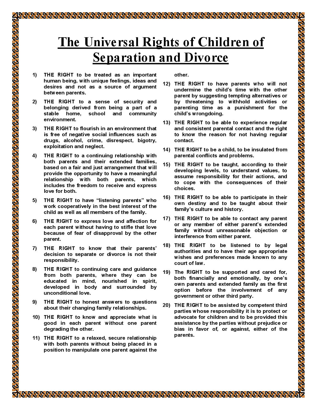 "This document has been assembled based on the input and collaborative efforts of many parents and children and has been produced with the intention of providing help and guidance to more mature children of divorce and/or separation who wish to know what their basic right s are when it comes to their choice of the parent they