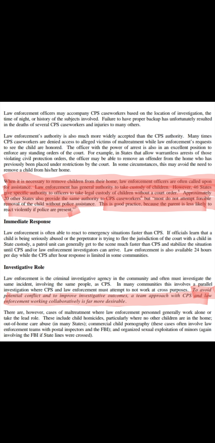 They know parent(s) instinct would be to act violently if workers tried to take a child away. So they decide to tell agents to hide behind police.