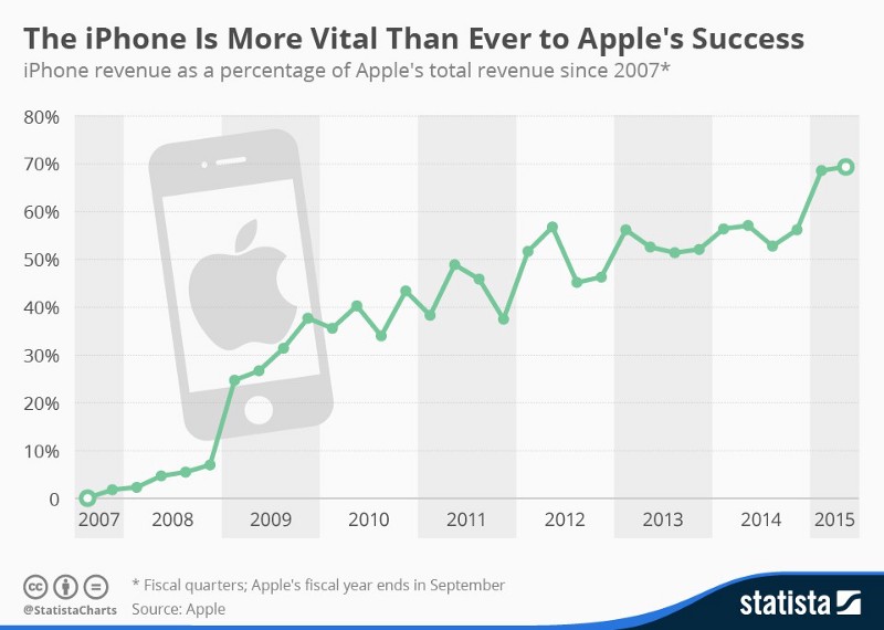 Apple’s revenue is 70% I-PHONE, totally dependent on sales of that product.