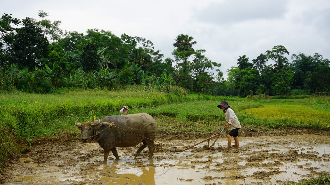 Farmers Plowing Rice Fields in Traditional Ways
