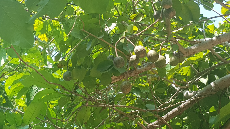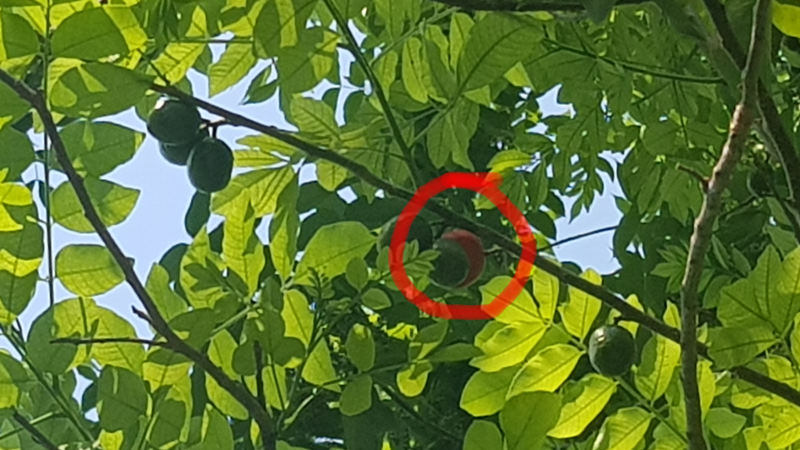 #4 "green-golf-balls" - These round things were about the size of a golf ball. The leaves are fairly rigid and the bark of the tree was relatively smooth as you can see. The skin is kind of bumpy. I have no idea what is inside of them since I could not reach any of them yet.