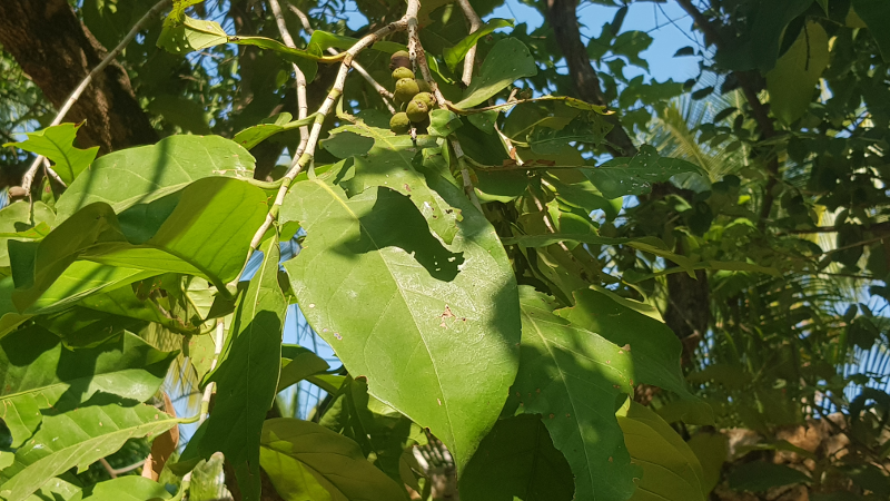 #7 "small-berries" - Big rigid leaves and strings of these small berries running down along the branches and twigs.