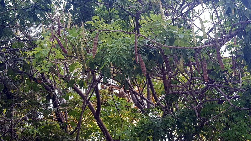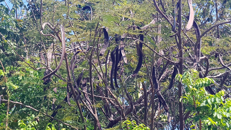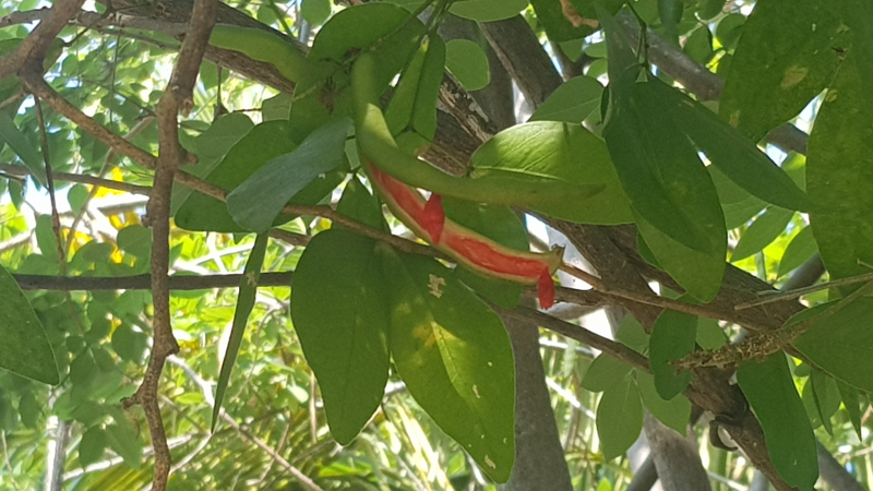 #1 "bean-pods-red-stuff" - They look like green beans, with rigid leaves. red stuff (the seed pods?) coming out. I'm not sure, but I think the bean part falls to the ground and shrivels up into a black spiral shape.