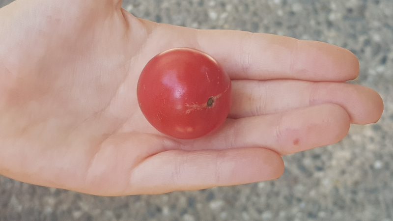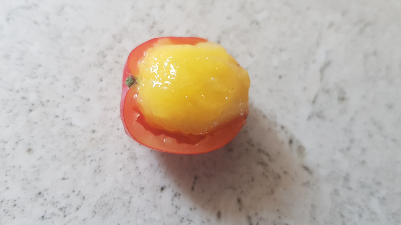 #3 "cherry-tomatoes" - These look very similar to cherry tomatoes, but they have a green, kind of bumpy skin on them while they are on the tree. The leaves are not as rigid as the bean-pods above. Not all of the red ones are perfectly round when they fall to the ground, some were oblong. Inside of the yellow meaty part there is a seed.