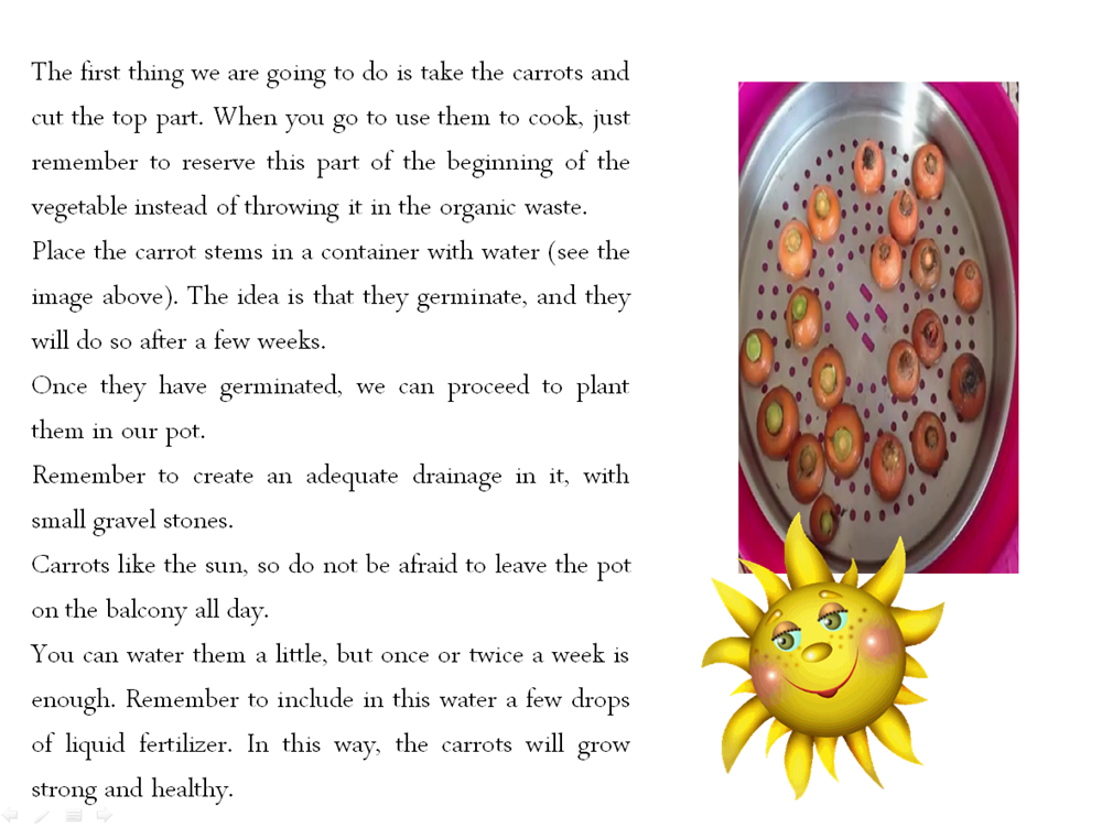 With only 5 carrots, a container or pot 30 cm deep and 50 cm long, soil enriched with ecological substrate (compost) and liquid fertilizer.