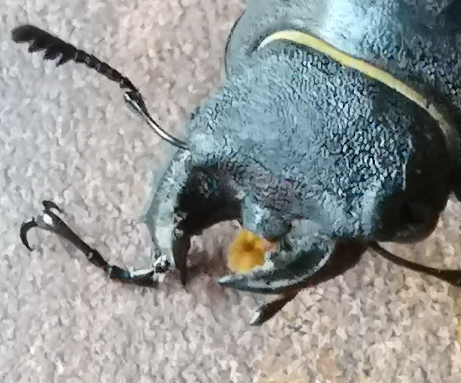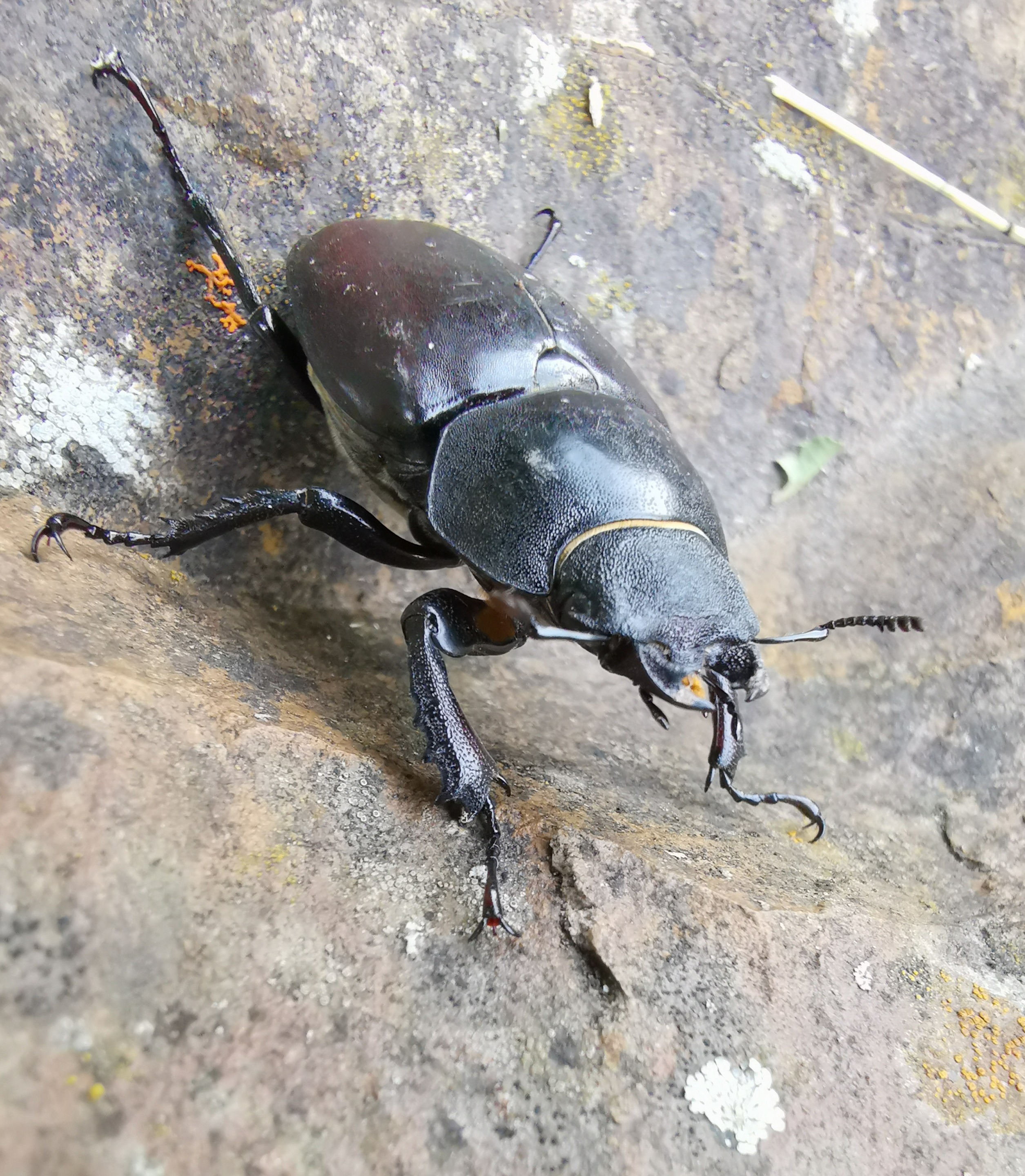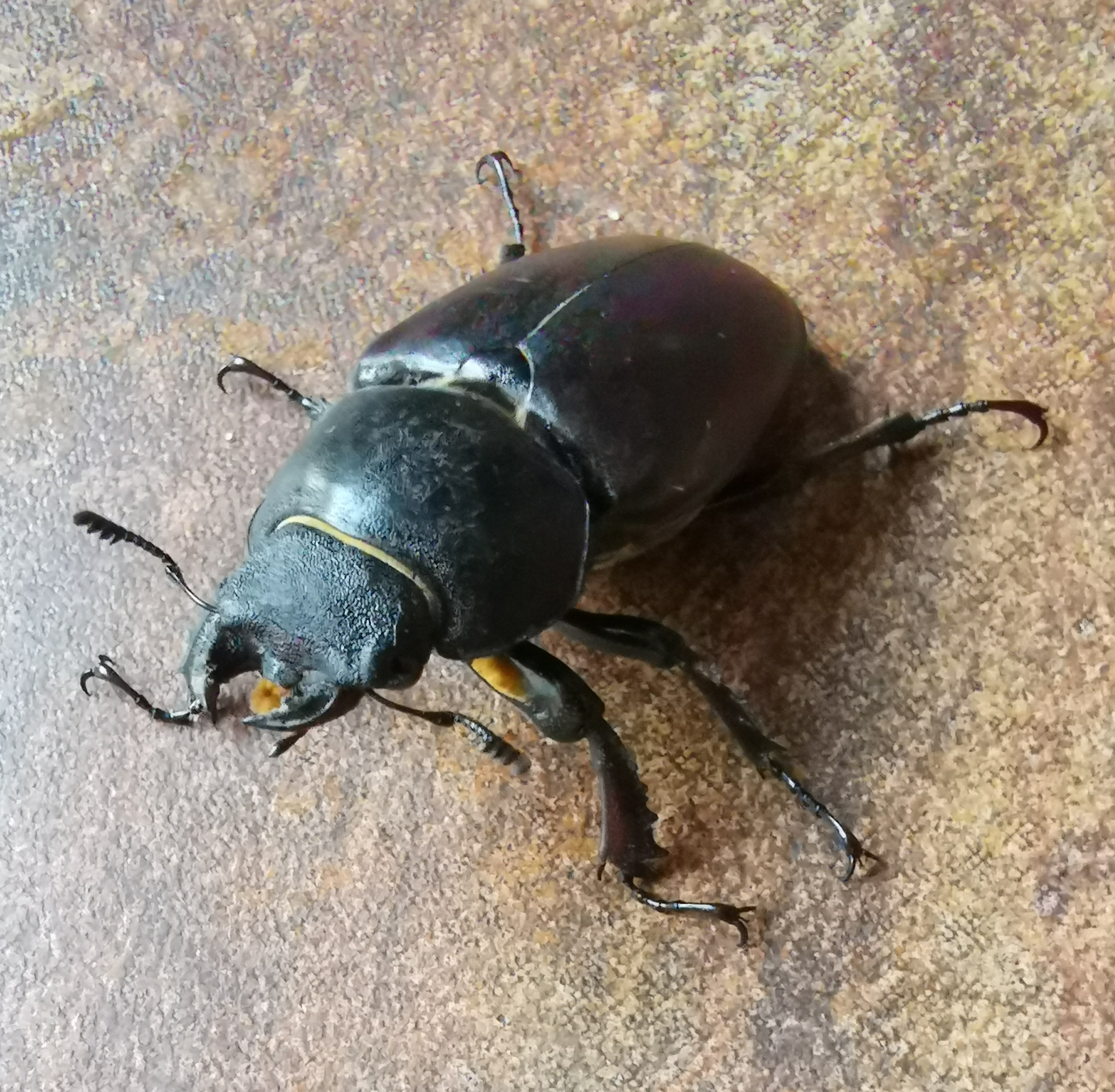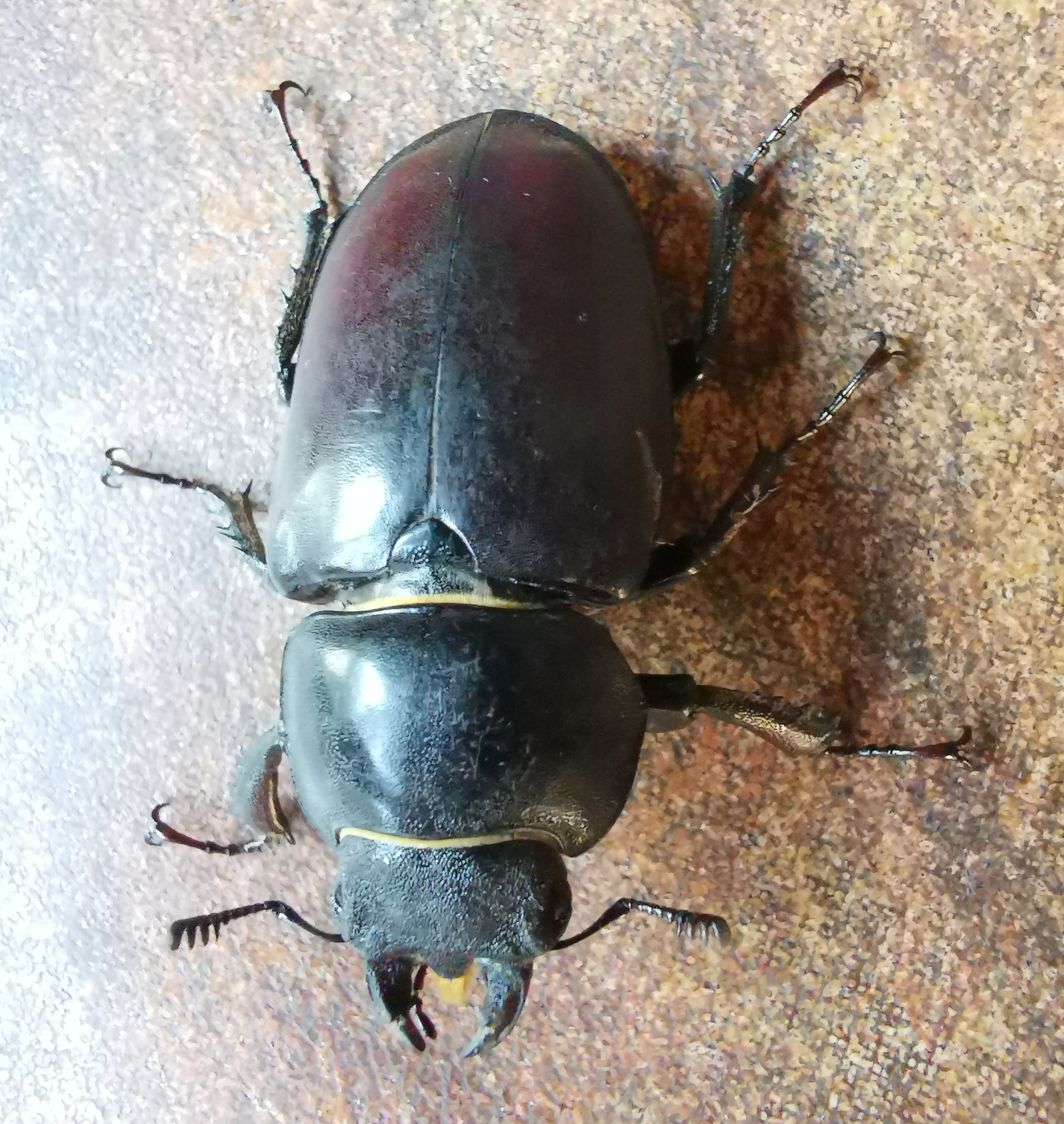 By the way, although the 'antlers' of a male stag beetle are much larger than the mandibles of the female, the latter can bite much more painfully. The male's jaws are mainly used to fight against rivals competing for a female and to hold on to the chosen one afterwards, during mating, but not for feeding.