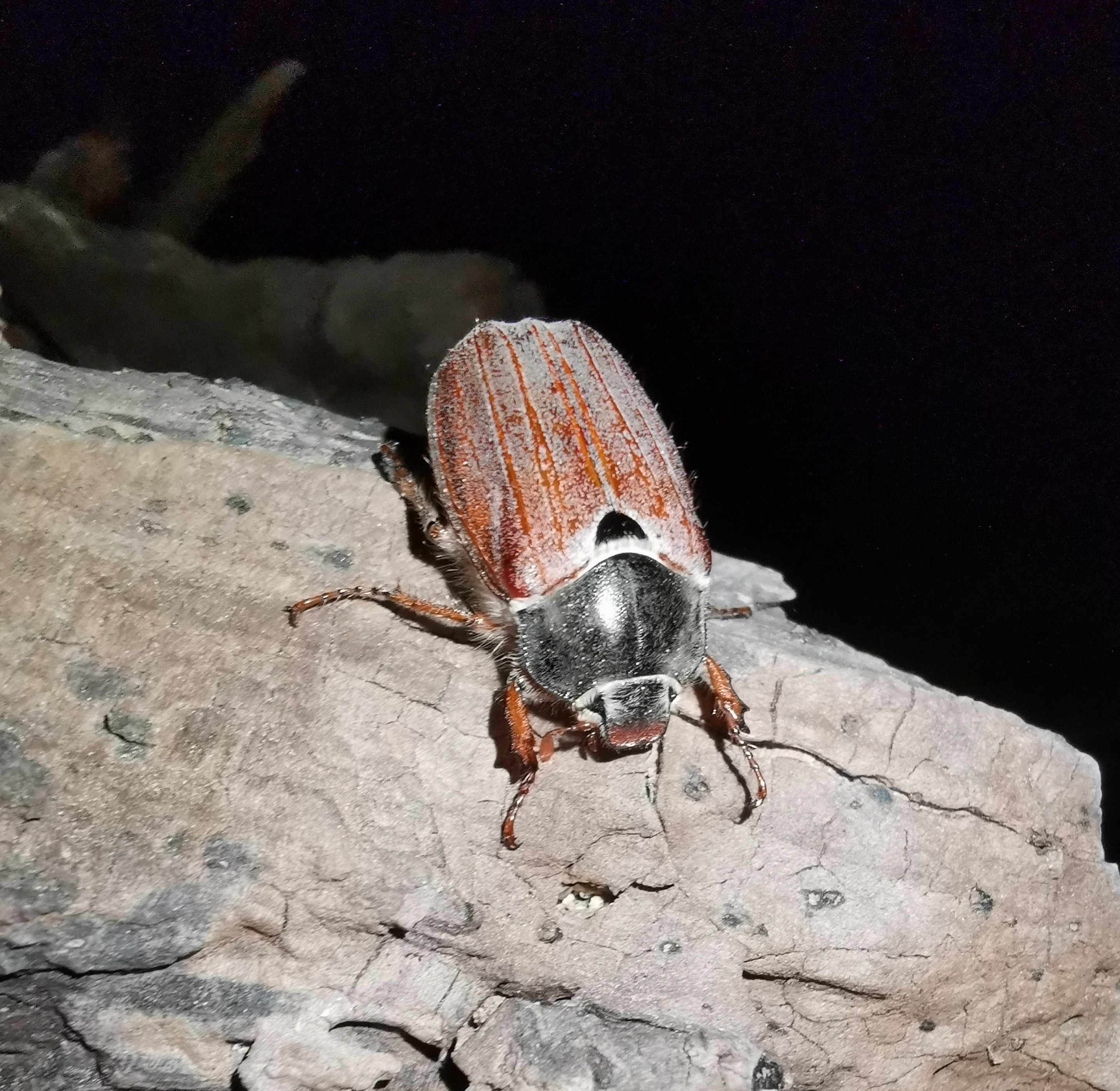 Ich fand den Käfer nachts in unserem Garten, setzte ihn auf meine Hand, um Details besser darstellen zu können und ließ ihn schließlich auf einer Pflanze 'Armenischen Mohns' (Papaver bracteatum) wieder frei, unter dessen Blättern er sich rasch verkroch.