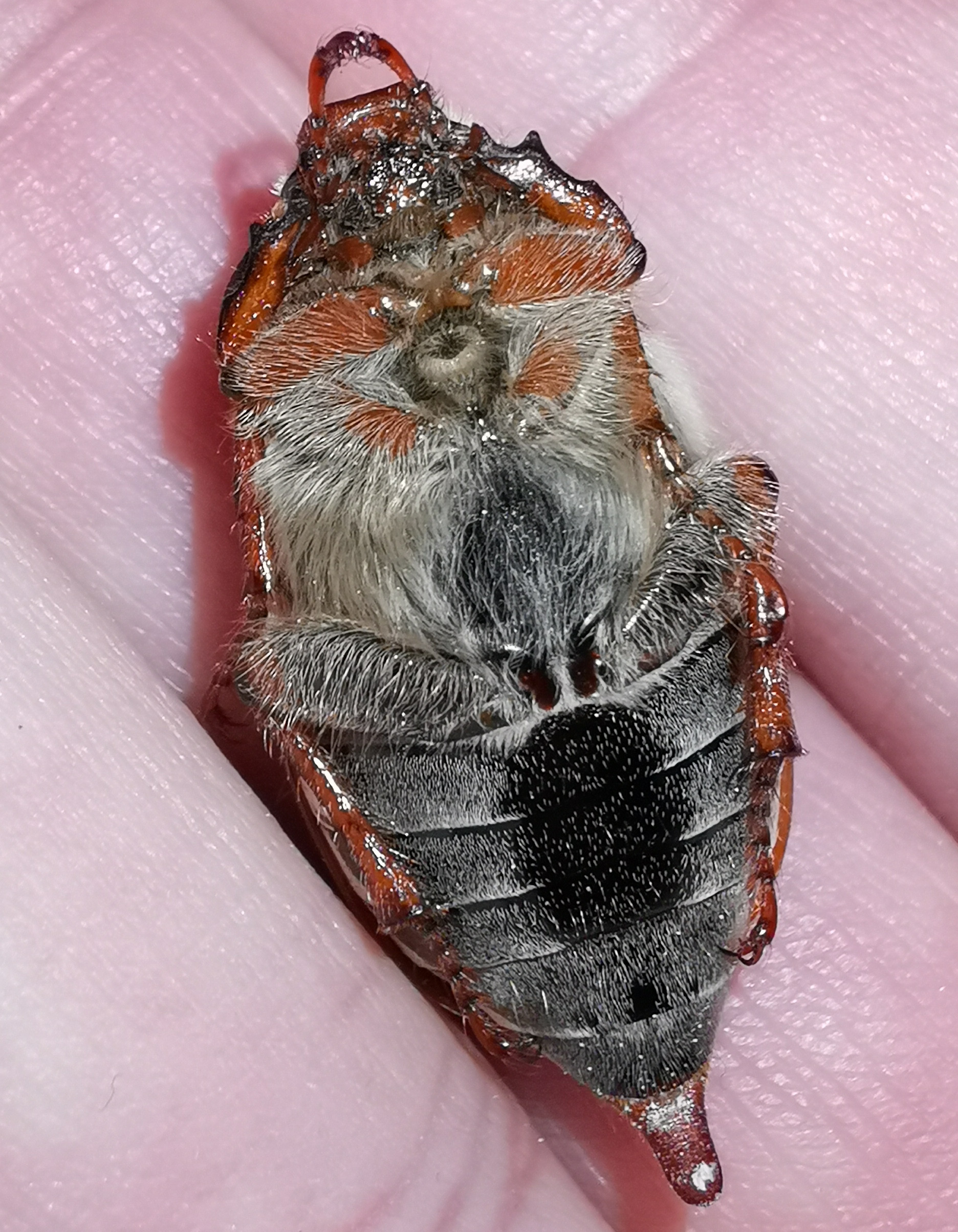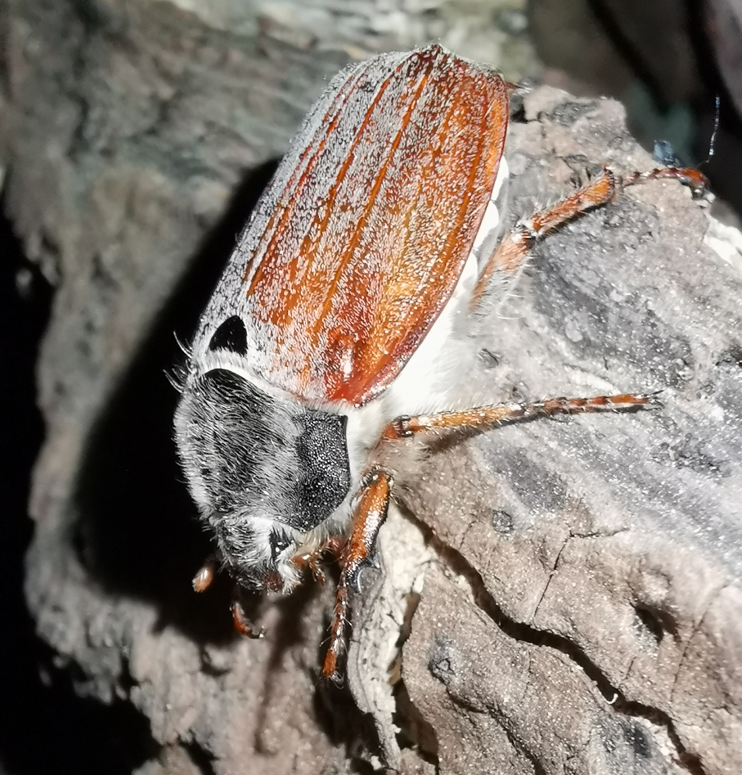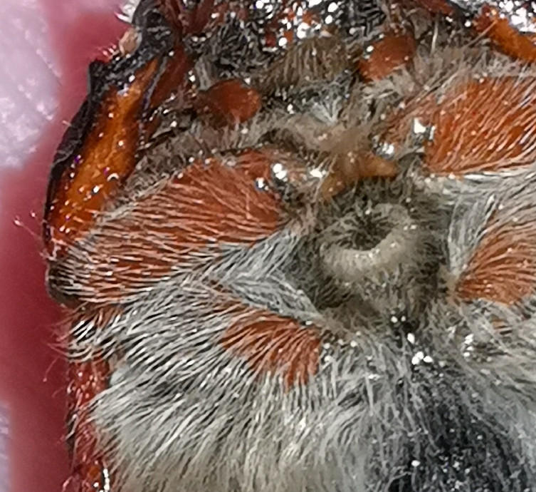 In this picture the white triangular spots on the flanks of the abdomen, which are characteristic for cockchafers, are clearly visible. Auf diesem Bild sind die für Maikäfer charakteristischen weißen, dreieckigen Flecken auf den Flanken des Abdomens gut erkennbar.