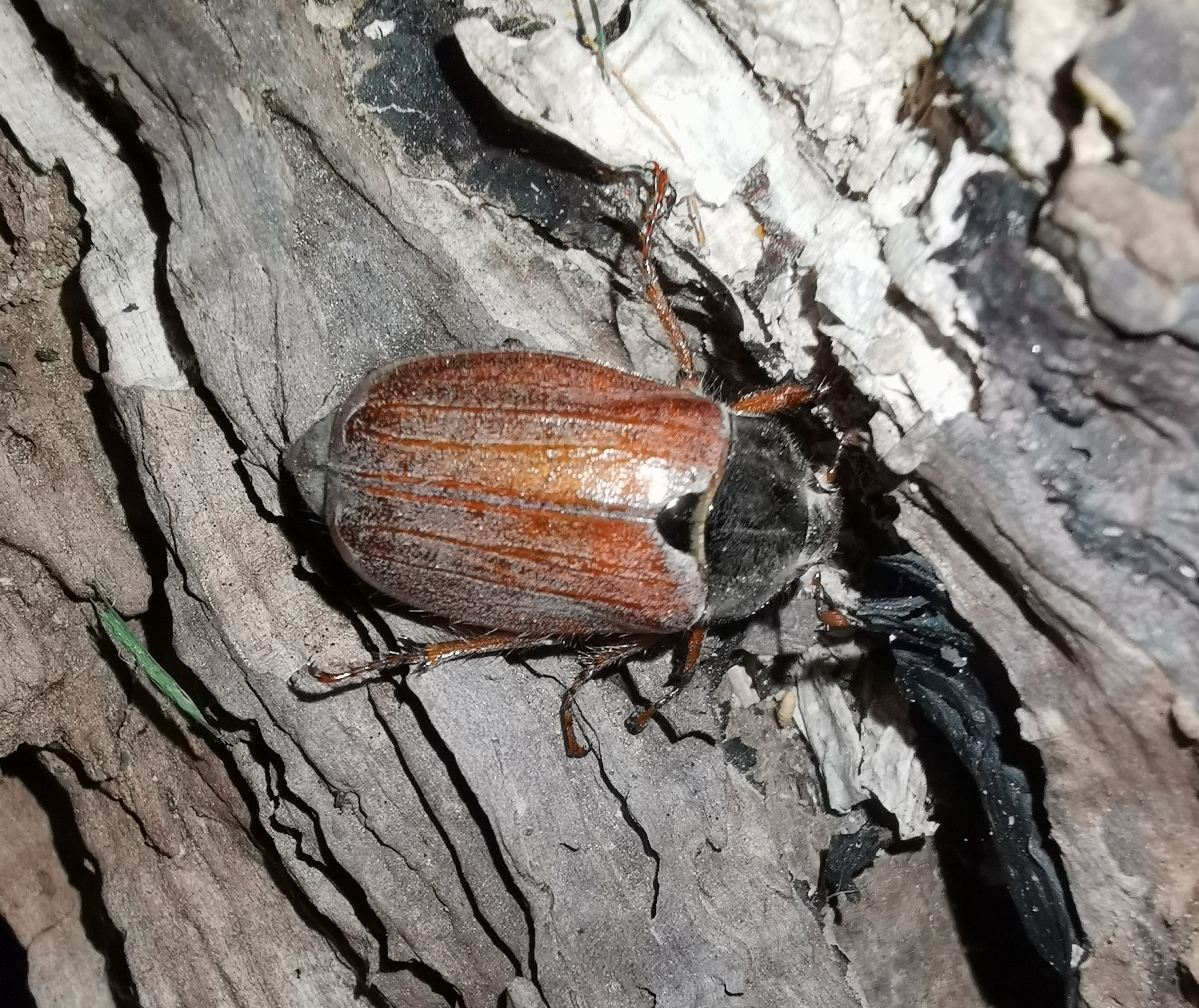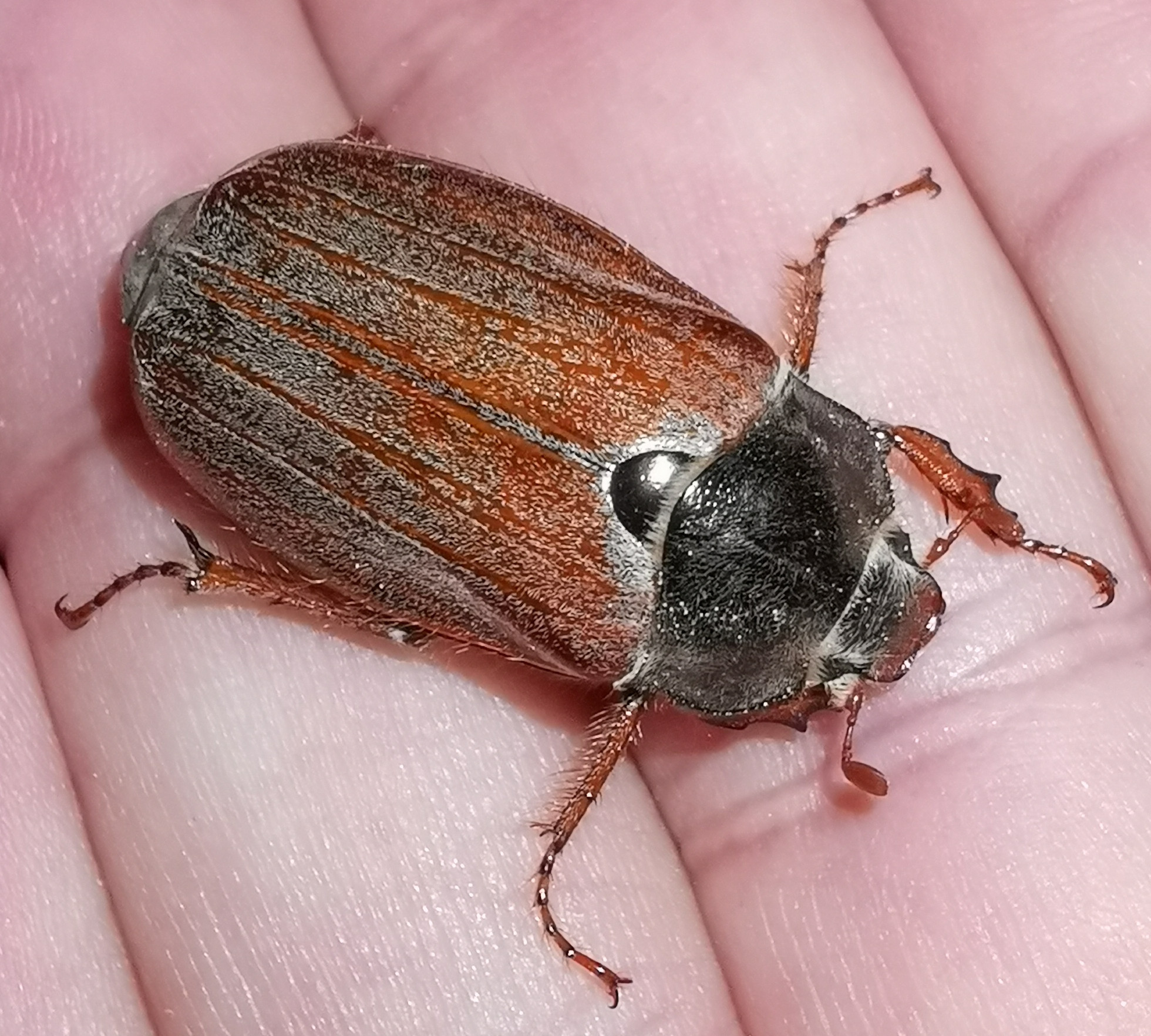 (Due to the not knotty thickened tip of the abdomen - pygidium - I assume that this beetle doesn't belong to the exact species Melolontha hippocastani, but Melolontha melolontha.)