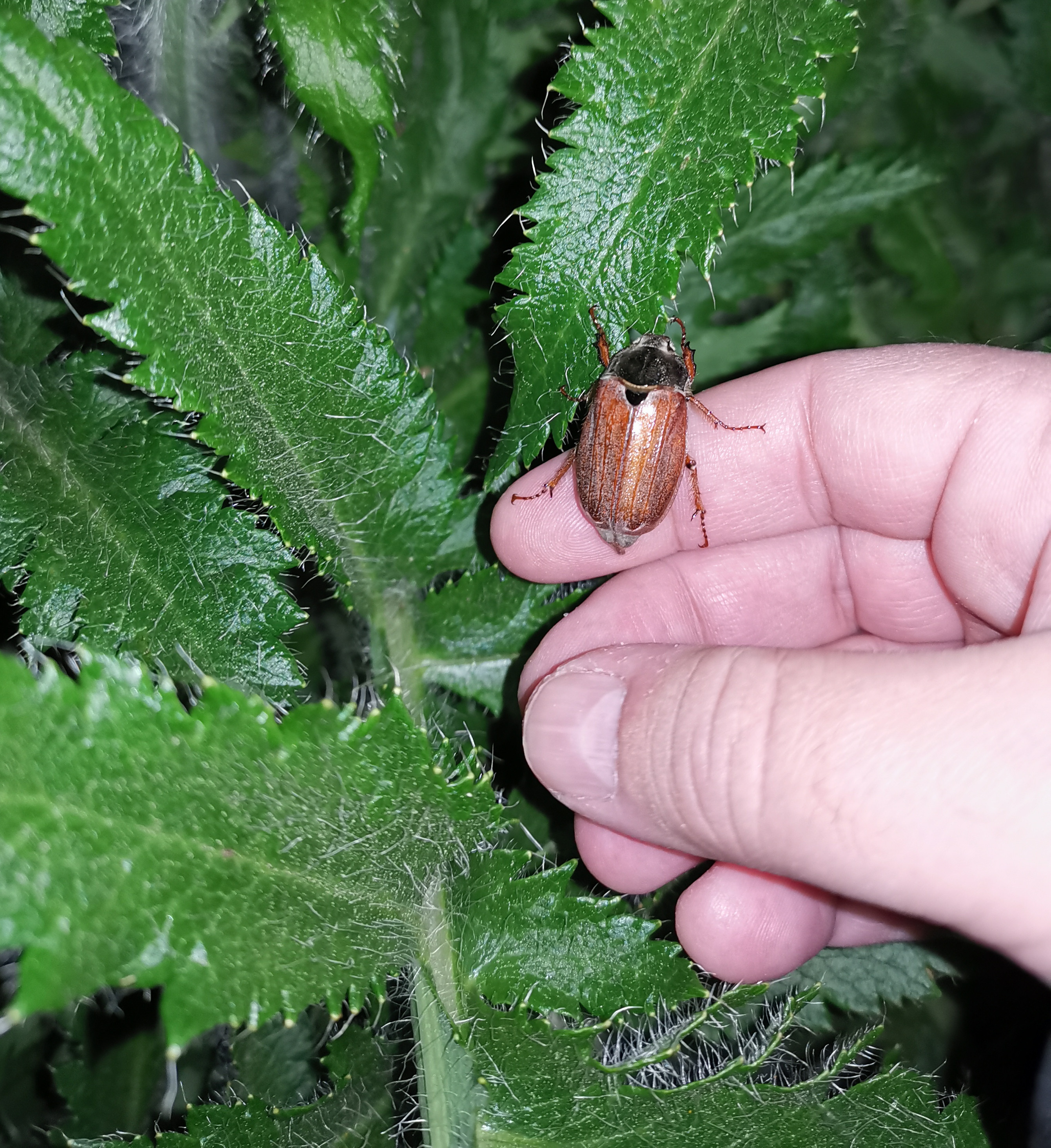 I found the beetle in our garden at night, placed it on my hand to better show details and finally released it on a plant called 'great scarlet poppy' (Papaver bracteatum), under whose leaves it quickly hid.