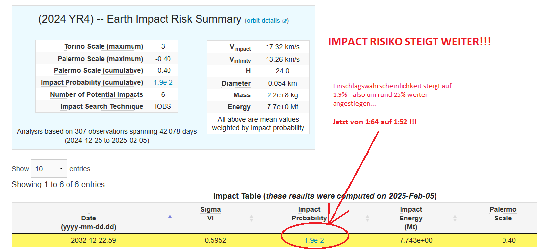 Entgegen der Darstellung der Mainstream Medien steigt das Einschlagsrisiko des Asteroiden 2024 YR weiter an.