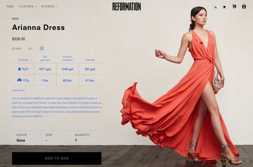 엘에이에 베이스를 둔 리포메이션은 패션 하우스에서 재고 직물을 구하여 친환경 직물을 사용해 엘에이 특유의 섹시하면서도 세련된 스타일을 만든다. 또한 이런 친환경 소재들을 가지고 웨딩드레스까지 만든다. 최근 리포메이션은 자신들의 상품을 구입하는 것으로 얼마나 많은 물과 에너지를 절약할 수 있는지 알려주는 어플리케이션 또한 출시하였다. 그들은 환경에 나쁜 영향을 주는 직물로 크게 A,B,C,D,E 카테고리로 나누어 놓았으며, A,B의 카테고리에 있는 천연 섬유 또는 재활용 섬유 등 친환경적 소재만을 사용해 제품의 75%를 만드는 것을 목표로 한다.