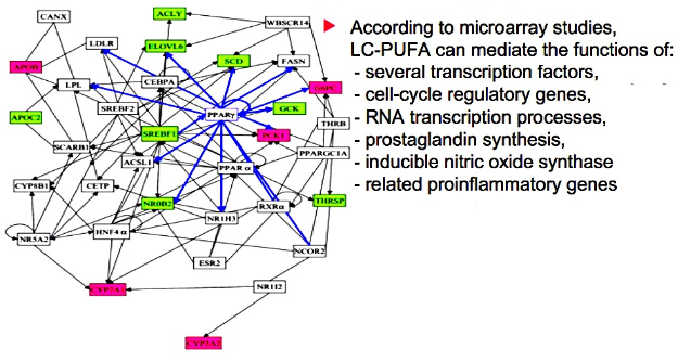 The giant web in the graph above shows us the different ways that the long-chain polyunsaturated fatty acids can affect different genes in the body. These genes connect to a low microscopic level, that being the connection to the nucleus of our cells. The green are indicative of a down regulation while the red portray an up regulation. The clear portrays no regulation for a given gene in the picture above. It is notable that both sides up regulate and down regulate depending on the gene that it is impacting.