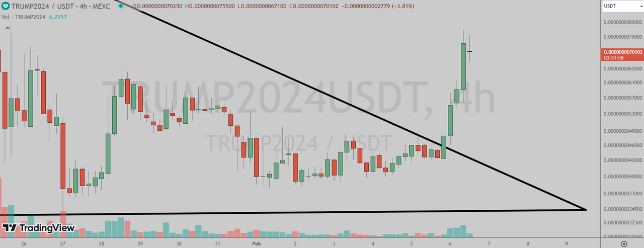 Donald Trump (MEXC: TRUMP2024USDT) has broken out of the triangle pattern in the four-hour chart.