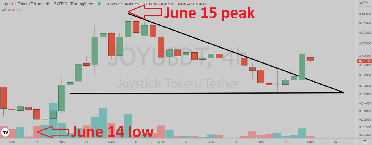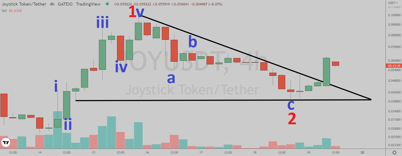 Joystick (Gate.io: JOYUSDT) has broken out of the triangle pattern in the four-hour chart.