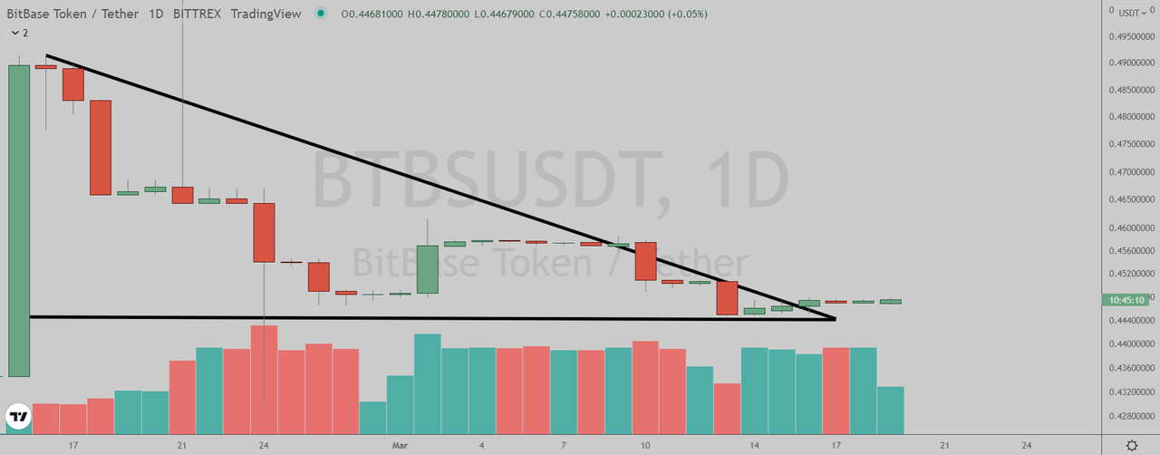 BitBase Token (Bittrex: BTBSUSDT) has broken out of the triangle pattern in the daily chart.