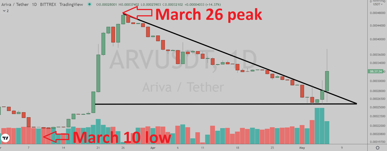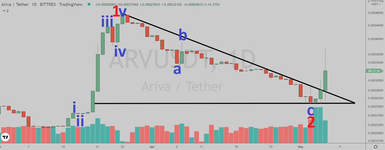 Ariva (Bittrex: ARVUSDT) has broken out of the triangle pattern in the daily chart.