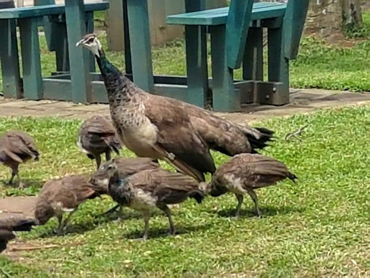 Seven little brothers and sisters for Mommy Peahen to take care of while Daddy Peacock is out and about probably looking to attract another Miss Peahen with his brilliant plumage.