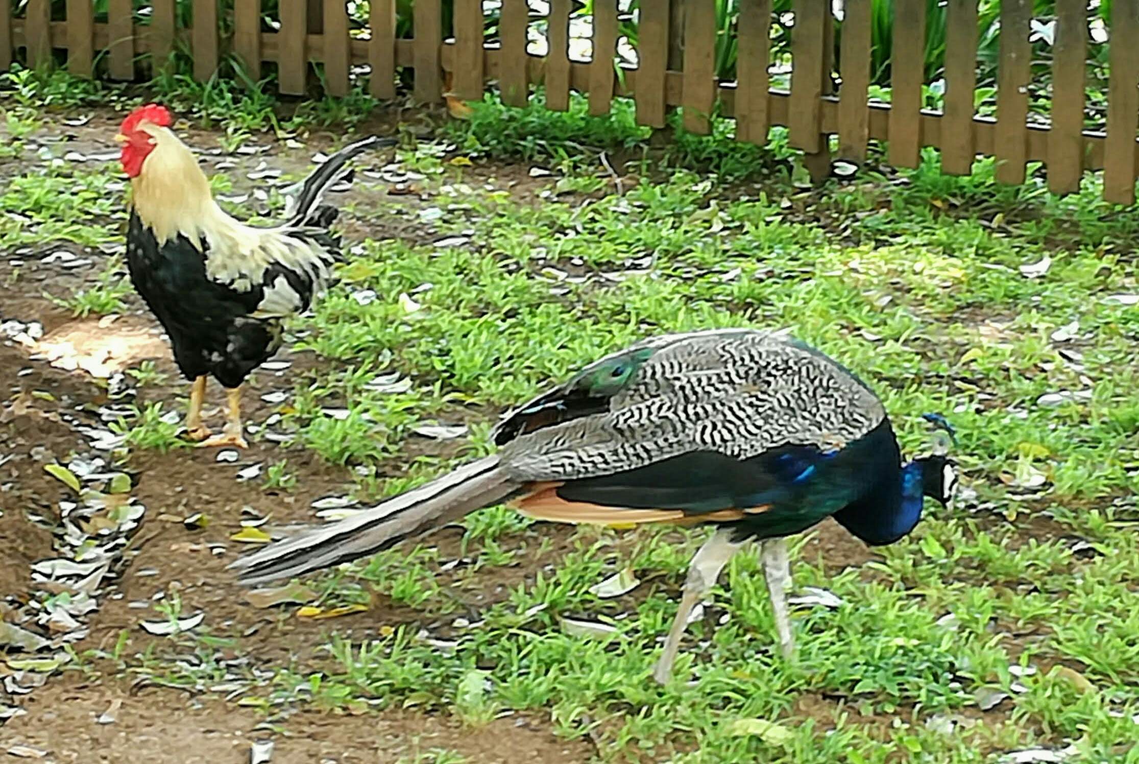 Mommy Peahen does not look enticing at all, no pretty feathers like her male counterpart! She's smaller in stature and her dull plumage gives her an advantage in the wild as it's easier to camouflage herself.