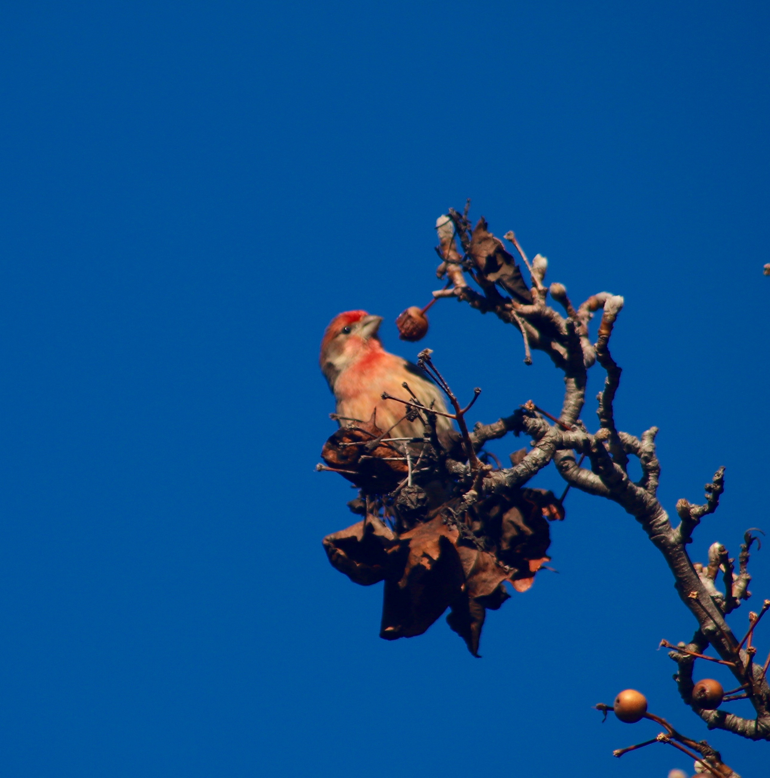 House finch working on some berries. This is one of those photos with 10 photos before and 10 photos after. Most with his head behind a berry, turned away, or out of focus. And this one isn't even what I had hoped for. The joys of photographing birds.