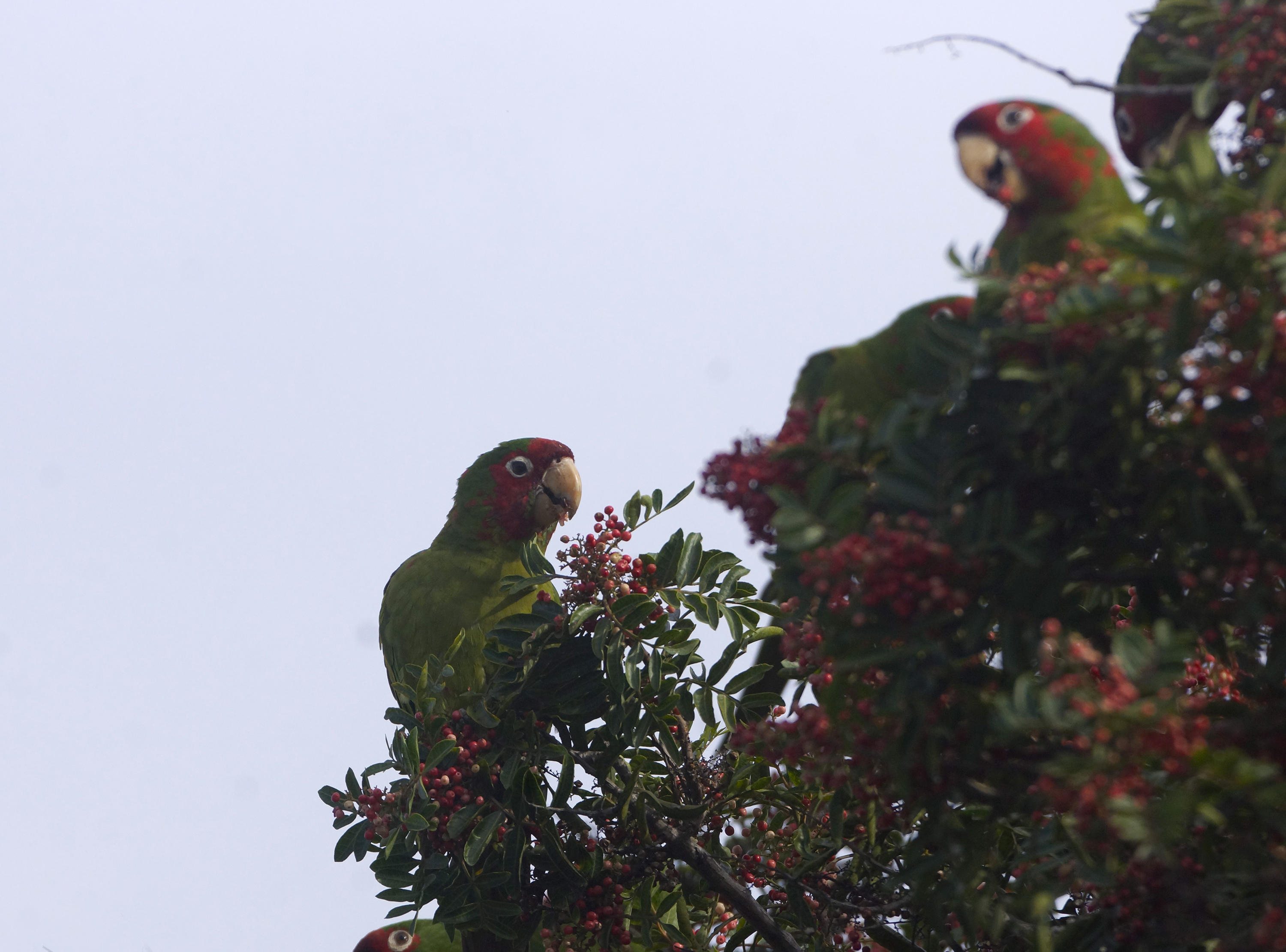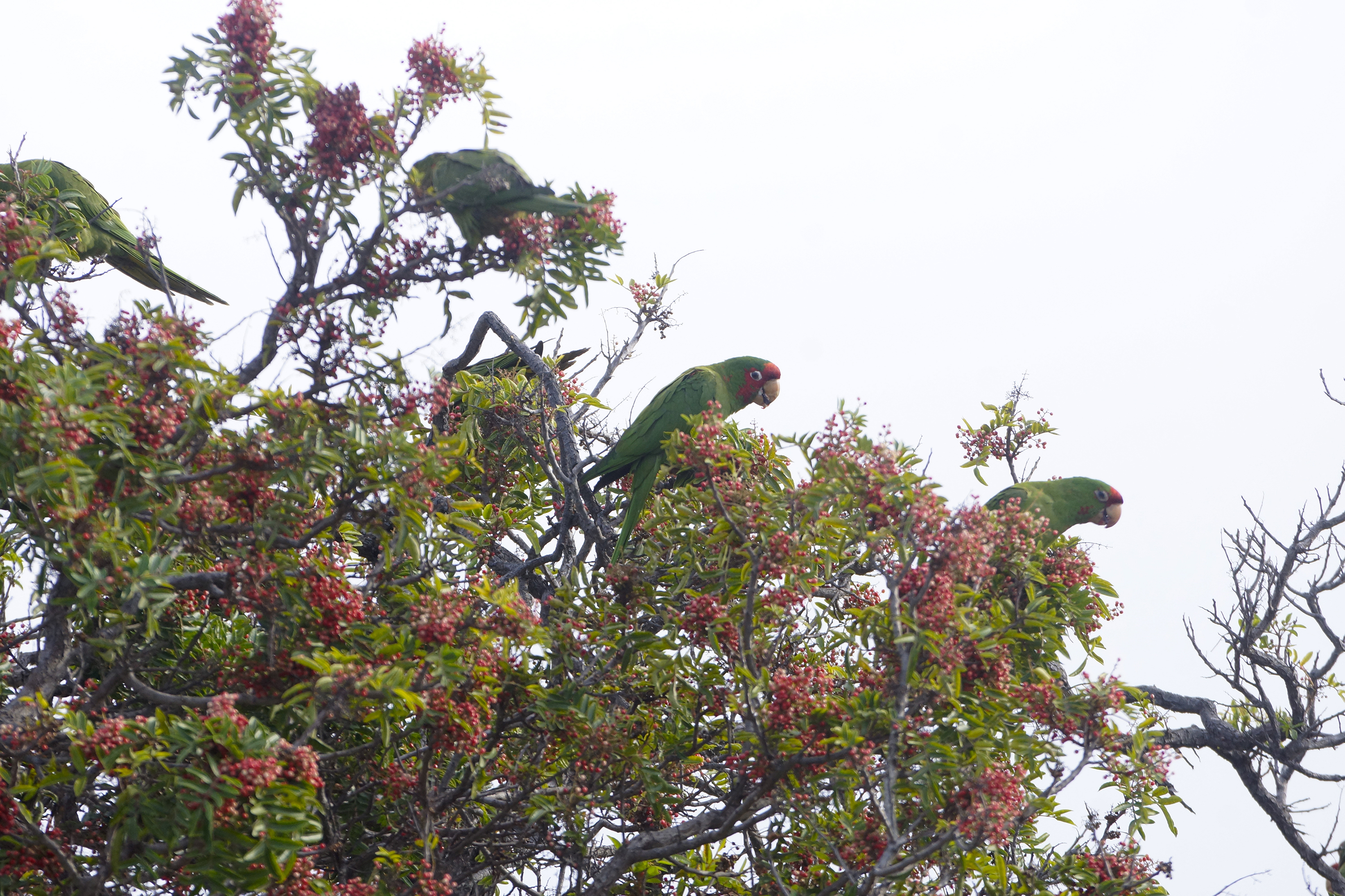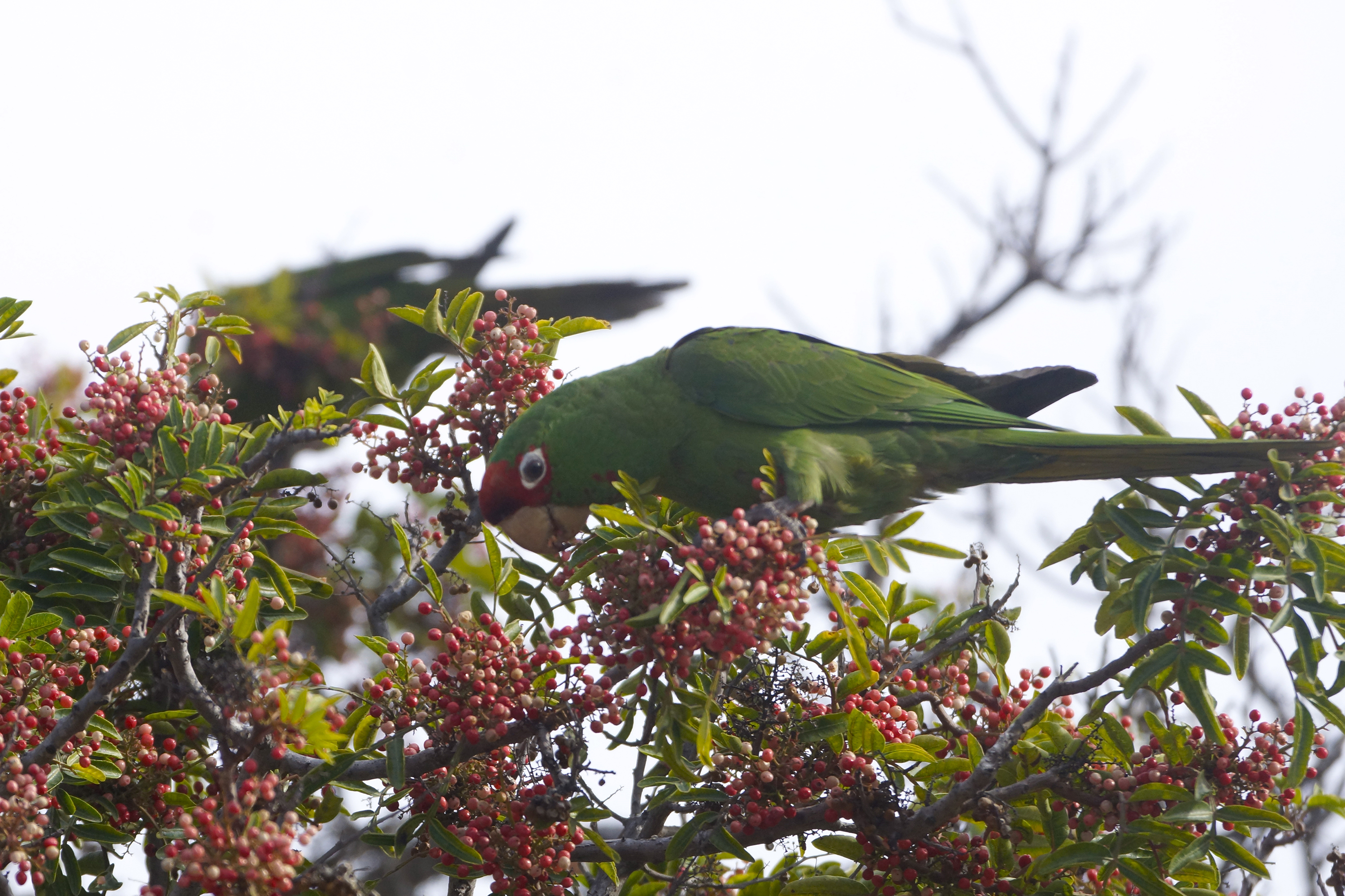 Australian green parrots in California eating white pepper in a California pepper tree! I had no idea these crazy characters ate pepper.